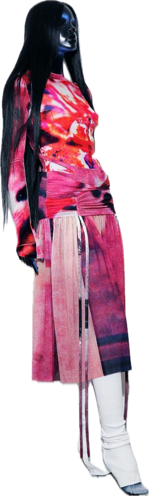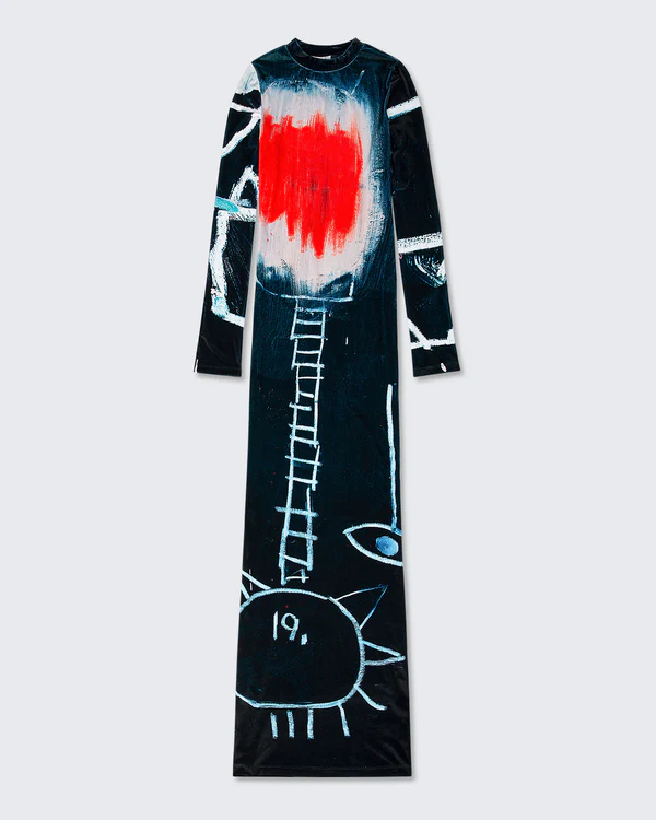 2 HAND MADE COUTURE LOOKS, USING PREVIOUSLY UNSEEN BASQUIAT PAINTINGS AND PHOTOGRAPHS TURNED INTO PRINTS ON STRETCH VELVET.